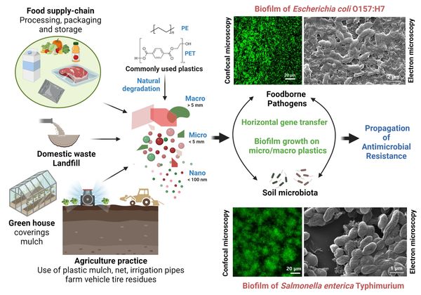 Microplastics and Food Safety: Emerging pollutants such as microplastics and nanoplastics are ubiquitous in the natural environments. Plastics as chemicals are intricately related to foods and food production venues at pre- and post-harvest stages. A growing body of scientific evidence indicates that these weathered plastic fragments of different sizes may interact significantly with microorganisms present in agroecosystems and even in foods. We investigate how microplastics may influence foodborne pathogens, biofilm formation, and antimicrobial resistance.