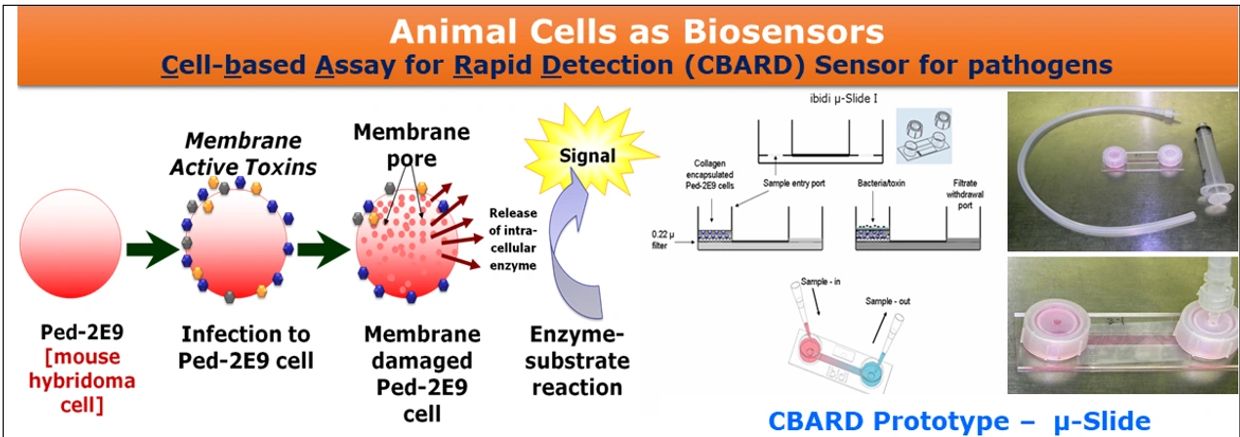 Cell-based Assay for Rapid Detection (CBARD) Sensor for pathogens. Our lab has developed novel cell-based biosensors to distinguish viable or pathogenic bacterial cells from non-viable or non-pathogenic cells and active toxins from inactive toxins from food.